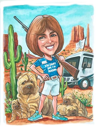 These caricatures make special gifts. Original watercolor illustrations on board, Personality Portraits caricatures can incorporate as many personal touches as you can think of. Favorite locations, homes, motorcycles, cars, hobbies, special events- all can be included. These make great wedding, graduation, retirement, or birthday gifts for the person that you want to do something special for!Price includes a pencil comp phase where you can see the work before it goes to color.