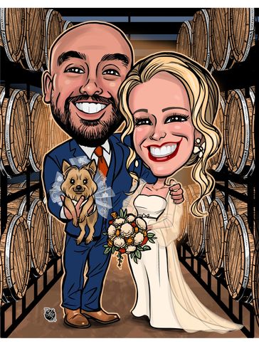 My most popular caricature for gifts! Price includes hi-res digital file that you can print anywhere. Incorporate as many personal touches or ideas as you can think of! Favorite locations, homes, motorcycles, cars, hobbies, special events- all can be included. These make great wedding, graduation, retirement, or birthday gifts for the
